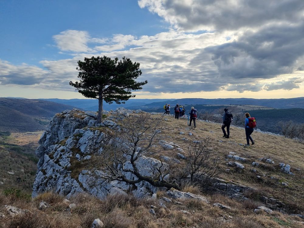 Nakon podulje pauze, gableca iz ruksaka i uživanja u stijenama i u pogledu, nastavljamo dalje. Neki postavljaju pitanje koji nam je cilj današnjeg izleta. Pa Ušesa Istre. A koliko smo kilometara prešli? Pa… 2 kilometra. A prošla su već 2 i pol sata. A koliko još ima kilometara? Pa… još samo 12. Ali pitaju se još i kakva je staza dalje, jer do Ušesa Istre smo se samo spuštali. Ubrzo dobivaju odgovor. Nakon bajkovitog puta kroz šumarak, uz male stijene obrasle mahovinom, slijedi strm uspon, duljine otprilike 1 kilometar. Strmina se zatim polako smanjuje, nakon čega slijedi šetnja širokim putem po vrhu grebena, s kojeg se pružaju lijepi pogledi na sve strane - na Učku i Žbevnicu iza nas, na prostrane pašnjake lijevo i desno od staze, na manje vrhove koji su nas okruživali. Ma milina...